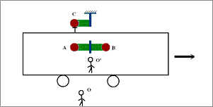 No interior do mini-lab existem duas bolinhas A e B e duas molas, como mostra a figura 5. As bolinhas A e B estão fixas a molas comprimidas e travadas, e em repouso em relação ao mini-lab. Uma terceira bolinha C está no teto do mini-lab e no compartimento exterior, mas fixa ao mesmo. No laboratório original que contém o mini-lab existe uma terceira mola fixa ao teto. Esta terceira mola não está comprimida e localiza-se exatamente no trajeto por onde irá passar a bolinha C quando o mini-lab entrar em movimento.