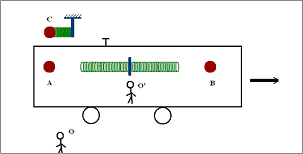 Num dado instante o observador O aciona um mecanismo a colocar o mini-lab em movimento (figura 6) a uma velocidade v (pode ser uma velocidade pequena, pois não vamos aqui testar a teoria da relatividade de Einstein). Quando a bolinha C encostar na mola distendida, ela começa a comprimir a mola e vamos supor que, através de um mecanismo apropriado, ela solte-se do mini-lab e se fixe à mola exterior (deixando portanto de acompanhar o mini-lab). Ao final da compressão a mola trava-se, graças a outro mecanismo apropriado. Exatamente nesse instante o observador O' aciona um mecanismo a destravar as duas molas interiores e a soltar as bolinhas A e B. Estas ficam então soltas no espaço recebendo o impulso das molas ao se distenderem. Vamos supor, por facilidade, que o aparato foi construído de tal maneira que as duas bolas adquiram uma velocidade v, em relação ao observador O', igual à velocidade do mini-lab em relação ao observador O. Nestas condições teremos, ao final da experiência, as duas bolinhas A e C em repouso em relação ao observador O e a bolinha B com a velocidade 2v (figura 7). Em relação ao observador O', do mini-lab, as bolinhas A e C afastam-se para a esquerda na velocidade v e a bolinha B afasta-se para a direita também na velocidade v.