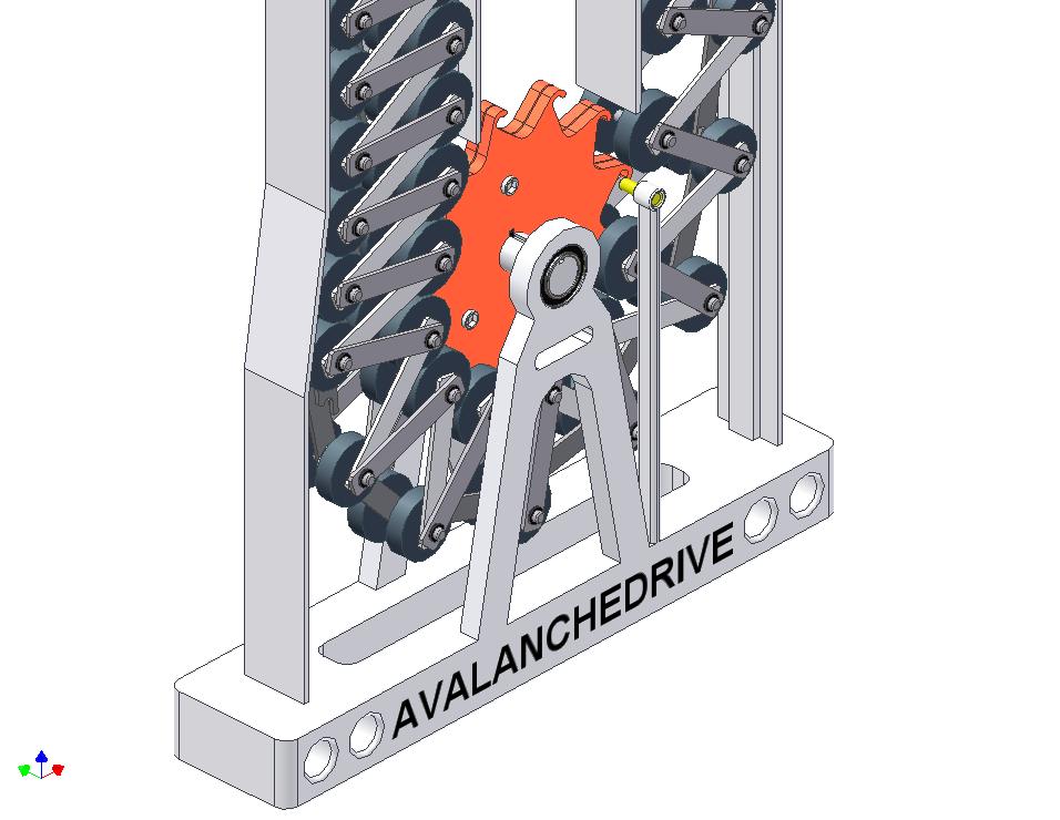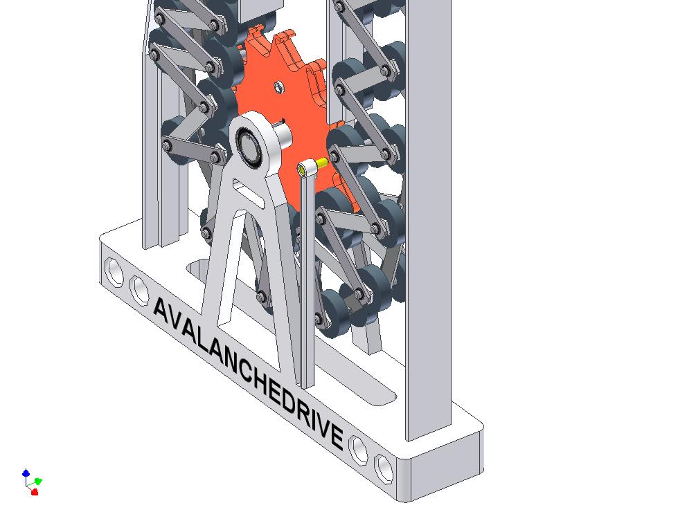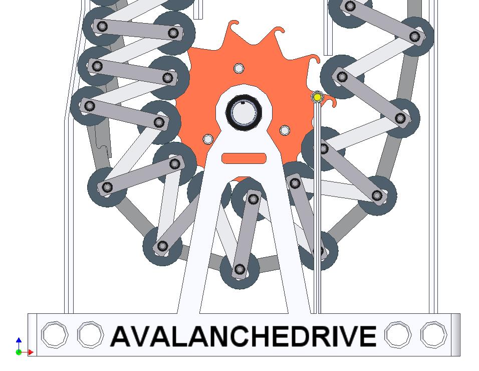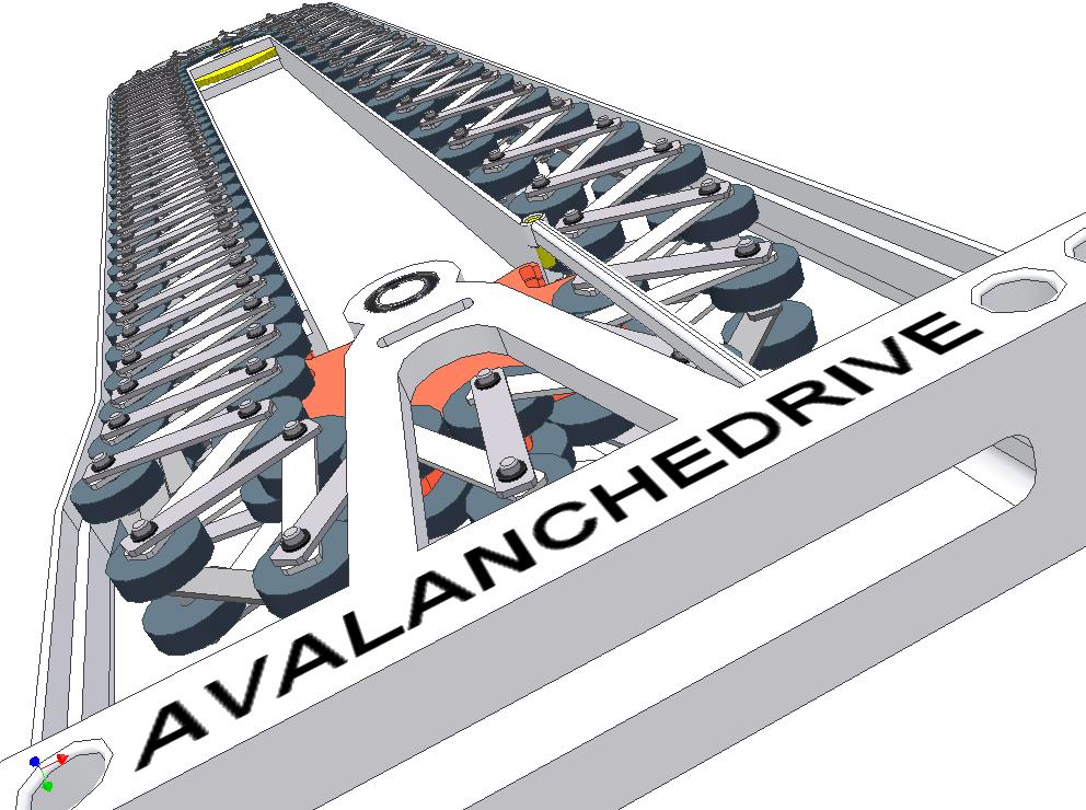 Inicialmente, são apresentadas 3 hipóteses de condução da lagarta, que é o corpo móvel principal e ativador do sistema FRCM Avalanchedrive. A chamada lagarta é um corpo articulado, estruturável por empilhamento e com peso longitudinal variável conforme seu estado; mostrado no desenho representativo da balança, onde aparecem, de cada lado, dois pesos iguais com alturas diferentes, em função do seu estado contraído ou expandido.