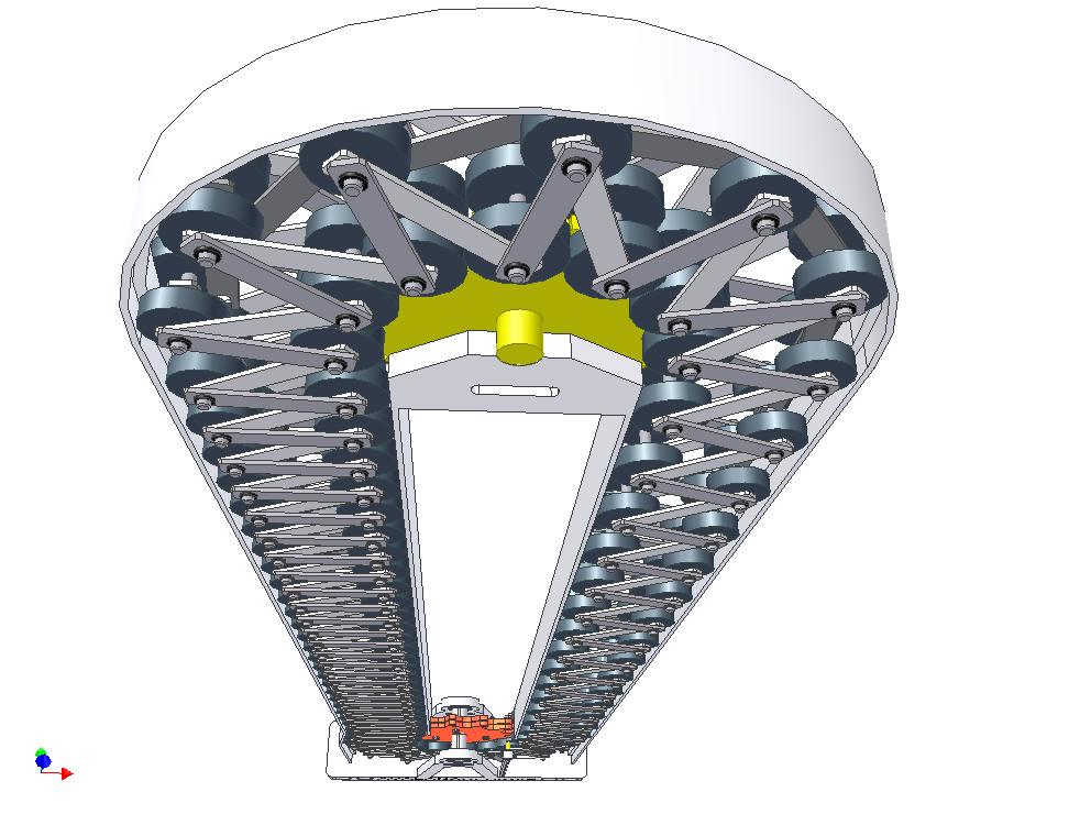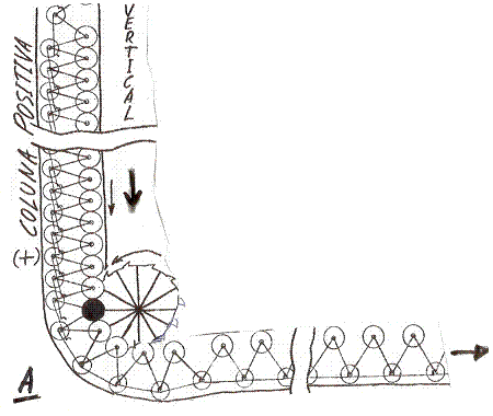 A (figura à direita), mostra uma lagarta em queda derivada para a direita, a 90º, através da roda reversora. Pode-se inferir a viabilidade de que ela, expandida, flua toda para baixo nesta direção sob seu próprio peso, conduzida pelos trilhos. Observar a ação dos ganchos da roda, da carga pontual sobre no primeiro gancho de contato, o início de abertura externa da lagarta e o atraque das travas ao ser atingido o ângulo de abertura máximo, formando uma estrutura alongada triangular. Fica evidente que a velocidade de fuga da lagarta seja compensadamente maior do que a queda na coluna contraída. Esta velocidade surge naturalmente pela abertura dos vértices forçados em posição periférica. A possibilidade de comando da velocidade de fuga poderá ser exercida através de frenagem, por dispositivo adequado, colocado no eixo da roda.