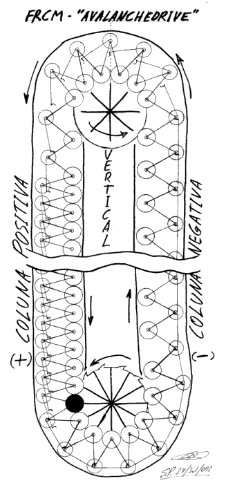 O corpo especial móvel, uma cadeia de massas vinculadas, não muito satisfatoriamente chamado de lagarta, assemelha-se a uma carreira articulada, elíptica e sem-fim, ou a uma corrente de vértices e articulações em zigue-zague. Ela é desenhada para facilmente acompanhar e preencher os canais da pista, também elíptica ou oblonga, sem-fim, oferecidos pela estrutura externa, de forma fixa e organizada na seqüência adequada. A lagarta é um corpo que, devido a suas articulações simétricas e repetitivas, pode facilmente encolher-se e esticar-se à vontade, ou seja, aceita passivamente o comando para maior ou menor adensamento, com variação de peso no sentido longitudinal, em setores independentes e distintos por toda sua extensão. O conjunto da pista de condução, com canais e trilhos, mais a lagarta, possui quatro setores diferentes: duas curvas de 180 graus, sendo uma inferior e outra superior, mais duas colunas de alturas iguais, paralelas e também verticais. Para que haja movimento, em cada setor existe um estado de compactação e/ou de estrutura para a lagarta, que são: a coluna positiva, com canais mais largos e que formatam a lagarta com sua maior densidade e contração, sob a ação livre da gravidade — massa unificada —; a curva de reversão inferior, com rodas e outros recursos, para que a lagarta ao ali passar seja aberta, travada, empurrada e tenha a direção do seu movimento dirigida contra a gravidade, basculada para o lado oposto; a coluna negativa, por onde, com mais baixo perfil e menor peso longitudinal, a lagarta, liberada pelo seu menor peso, recebe um impulso de baixo para cima; e a reversão superior, outra roda — com o ponto zero — a partir do qual o alto da coluna positiva é realimentado, pelo escape do fluxo da lagarta, já sem qualquer resistência. É na reversão superior que acontece aquilo que é o mais sensacional no FRCM: a reposição da energia que foi “consumida” pela decomposição fractal do potencial disponível na base positiva; por uma ironia técnica, é esta, do ponto de vista mecânico, a parte mais simples, bem resolvida e passiva do conjunto. Ao contrário da roda de reversão inferior, que tem que ser atracada à lagarta para forçá-la, a superior porta apenas contra-recuo, travas e nenhum acionamento além daquele próprio da lagarta ao passar. Fica fácil, mesmo para um não especialista, entender o prodígio deste princípio. Ele consegue decompor um acúmulo de peso, preparado para a finalidade, e transformá-lo controladamente em movimento e força. Não se trata de nenhum milagre. O peso físico absoluto do corpo dinâmico, a lagarta, sempre estará lá, no circuito; como a sua distribuição é propositalmente desbalanceada, e sua massa tem o equilíbrio permanentemente sustado e crítico, ela fluirá sob seu próprio peso. As duas colunas são confrontadas em espaço equivalente, mas com relação de peso até quatro vezes maior. O arranjo confinado de variação das massas em desequilíbrio é tal, que, à lagarta “só resta mover-se”, fluir sob seu próprio peso, constantemente e com carga renovada. A diferença de massa é compensada pela velocidade, que, se deixada livre, acompanhará a proporção de peso, até com o risco de disparo. Um cálculo hipotético permite o seguinte balanço: peso total da lagarta 10, perdas gerais 2, resistência da coluna negativa 3, saldo positivo e ativo 5 – 3 = 2. A “sobra”, que na hipótese tanto poderá ser 2kg como 2000kg, dependendo da escala do modelo, sempre estará disponível para aproveitamento no eixo da roda de reversão inferior e sempre estará em movimento forçado — desbalanceadamente — alimentado pela força da gravidade. Neste conversor energético, a força gravitacional tem o mesmo papel que a força do vento ou da água, convencionalmente usados em geração de eletricidade. No caso acima exemplificado, o desbalanceamento foi de apenas 1 para 1,66 e como o desenho da lagarta o permite, ela se recolherá de volta sobre a coluna positiva com uma velocidade 1,66 vezes maior do que o avanço de queda do principal empilhamento positivo, que trabalha como se fosse mola comprimida. O autor acha que esta é uma idéia que terá que ser de domínio público. É muito grande, vital e de urgente merecimento para o nosso único planeta disponível. Ela esteve sempre por perto, pedindo para ser descoberta, e é grande demais para pertencer a quaisquer pessoas ou grupos, sejam quais forem. Surgiu, como se um desenho original muito antigo, deixado para trás, só agora tivesse sido encontrado; algo que a humanidade, numa era muito mais adequada, devia a si própria, comunitariamente. Milhares de novos desenhos e concepções serão feitos no futuro, com cada vez melhor aproveitamento, durabilidade e custo. O uso intensivo de peças metálicas reaproveitadas, sem reciclagem, tornará tudo muito econômico. Fica difícil dar-se outros nomes ao FRCM sem se atropelar tabus físicos antigos, e cômodos. Mas que estejam prontos para a reconsideração, urgente, porque, o “avalanchedrive” , esta nova patente, funciona e muito bem; ou, na pior das hipóteses, traz agora para as mãos da engenharia moderna a solução de um sonho. O inventor só espera pelos méritos de autoria e concepção.