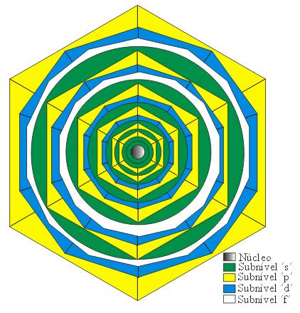 Considerando as quantidades de elétrons dos subníveis, ou seja, 2, 6, 10, 14, 18, 22 e 26, e as figuras abaixo representando a esfera o subnível s, o hexágono o subnível p, o decaedro o d e assim por diante, a idéia consiste sobrepor as figuras numa sequência que será explicada adiante.