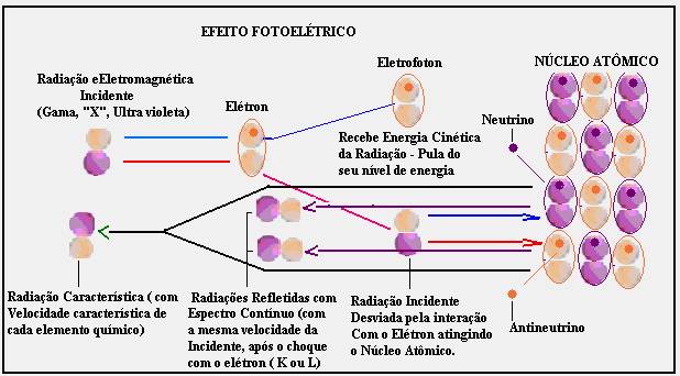 Acreditava-se que neste processo o fóton transferia toda a sua energia para um elétron localizado em uma das camadas atômicas, principalmente a K e L, e que as radiações eram emitidas pelas mudanças de níveis dos elétrons, que se reorganizavam para ocupar o loco do fotoelétron, mas o que realmente ocorre é que o raio interage com um elétron, e este elétron recebe parte da energia cinética do raio, que depende da velocidade do raio, pois, quanto mais veloz o raio, maior energia cinética o elétron irá receber deste raio, este raio permanece com a mesma quantidade das substâncias/energias magnéticas ( 01 positiva em união com 01 negativa) mas transfere para o fotoelétron energia cinética diminuindo a sua, porém, como é muito próximo ao núcleo, tal radiação, com energia cinética, atinge o núcleo e sofre o processo de reflexão da radiação gama, X e ultra violeta, como explanado na esquematização desta reflexão. Assim a radiação é refletida, independentemente do preenchimento de elétrons de outros níveis de energia (que será preenchida pela necessidade de neutralização magnética do posítron a mais do próton). Neste processo de reflexão destas energias, a radiação que atinge o núcleo é refletida com a mesma energia cinética, mas ocorre também, neste mesmo processo a liberação de uma radiação que tem energia cinética característica do núcleo que a emite, pois, a energia cinética deste raio depende da força magnética de união, entre elétrons e posítrons deste núcleo específico, que é determinada pela relação ente a força de união magnética e a massa nuclear, pois, quanto maior a massa atômica menor a força magnética de união e menor o impulso (energia cinética) que estas substâncias/energias magnéticas (01 positiva unida a 01 negativa) característica vai receber, determinante de sua velocidade.