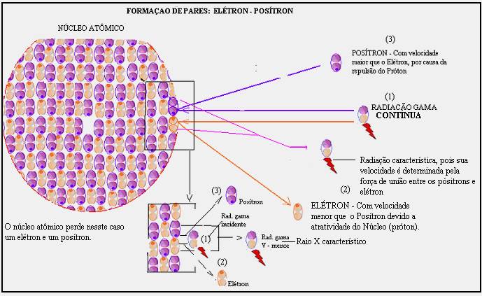 Também, na formação de pares, será emitida radiação característica do núcleo, atingido por esta radiação conforme a esquematização.